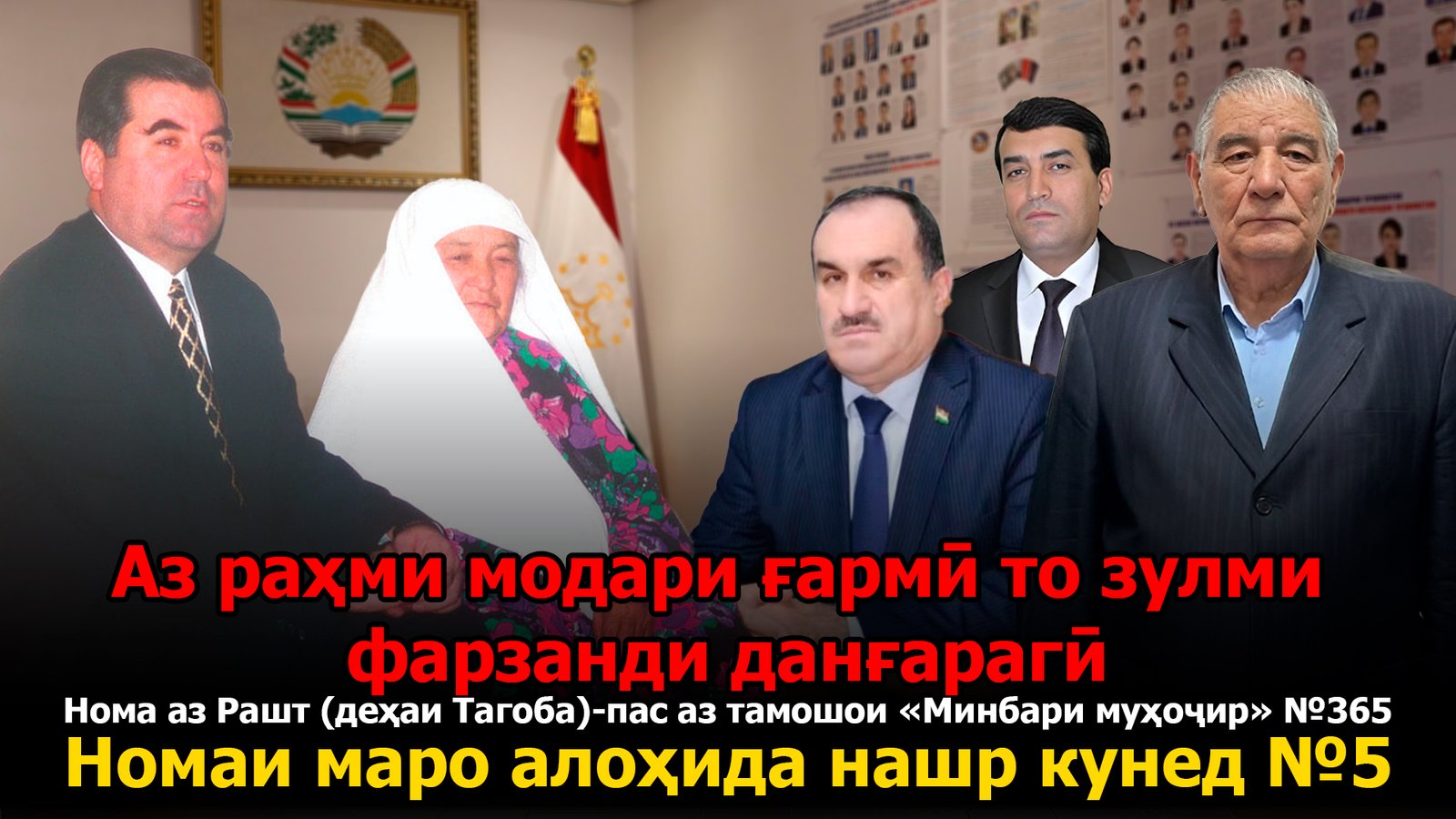 Ин нома аз Ноҳияи Рашт (ҷ/Тагоба) ба дасти мо расида, ин нома пас аз тамошои барномаи «Минбари муҳоҷир» №365 навишта шудааст. Нависанда худро корманди мақомоти қудратӣ муаррифӣ мекунад ва бо исрор мехоҳад овози мардум ба гӯши «кар»-и мақомот расад. Дар матн аз фишорҳои пайвастаи раисони ҷамоату маҳалла, ҳамдастии «амният» бо гумоштаҳои маҳаллӣ, «аблава» ва пулталабӣ, латукӯби ҷавонон, тарсондан бо талоқ ва «қасам», рӯйхатбандиҳои сиёҳ, бозии нангини мансабдорон бо номус ва обрӯи мардум, ҳамчунин аз бесалоҳиятии мақомоти тафтишотӣ ва нобаробарии оддитарин ҳуқуқҳо нома нигошта шудааст. Муаллиф далелҳои мушаххаси ҷолиберо меорад, аммо-ба хотири амнияти худ ва дигарон- хостааст номи баъзе ҷойҳо ва афрод пӯшида монад. Ин як додномаи ошкор аст бар зидди зулмҳо ва риёкориҳо; хоҳиши хело самимӣ: «садои маро алоҳида нашр кунед, то ҳақиқат аз байн наравад».
