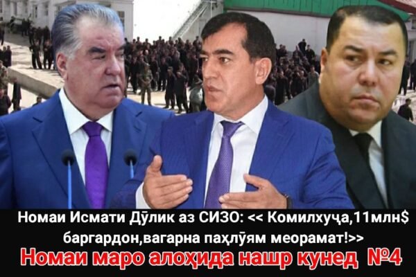 Номаи маро алоҳида нашр кунед №4 Номаи Исмати Дӯлик аз СИЗО: «Комилҳуҷа, 11млн$ баргардон, вагарна паҳлӯям меорамат!»   Ассалому алайкум, бародарон ва ҳамватанони азиз. Ба…